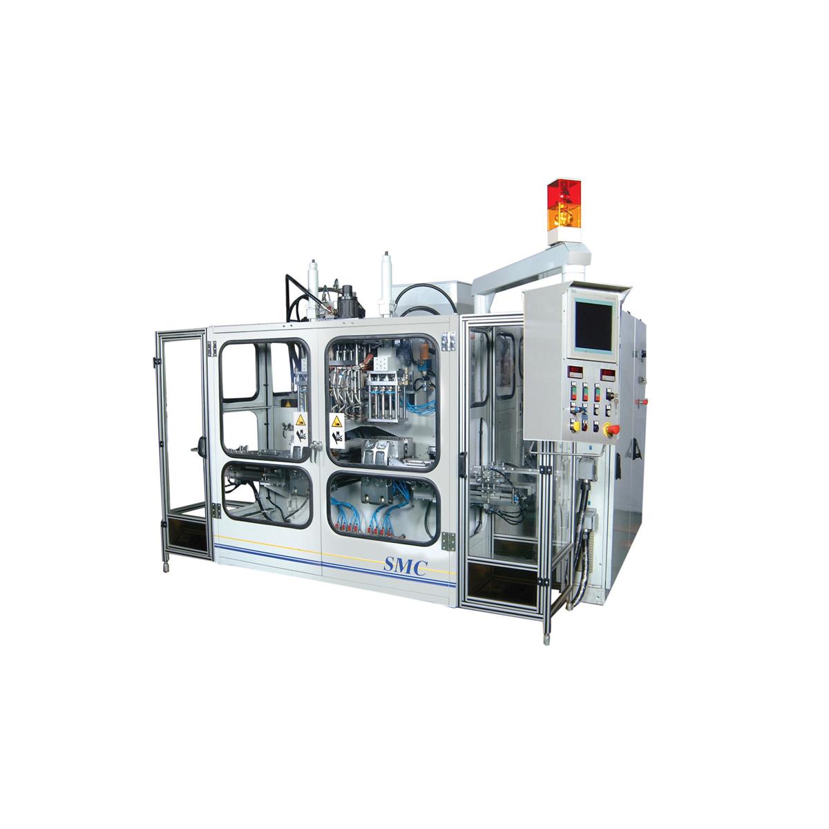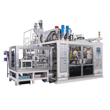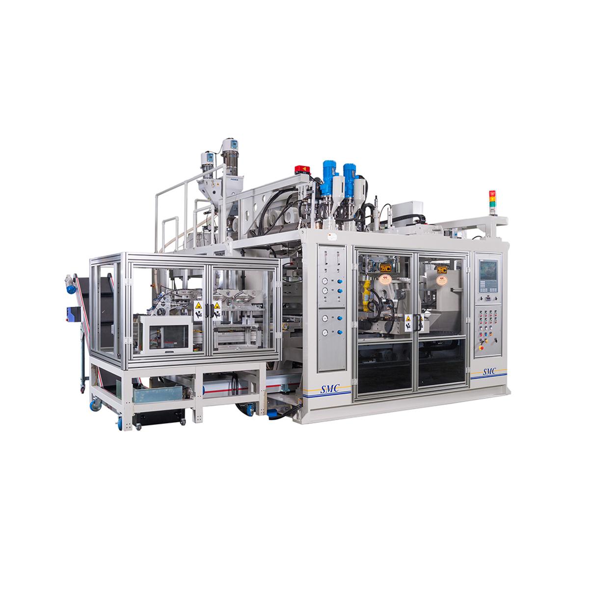 Linear clamping system on guide rails, using full proportional valve movement control. SMC’s high-end machine for fast and high-volume production of medium size containers ranging from 1-liter to 10-liter containers. Machine Features: