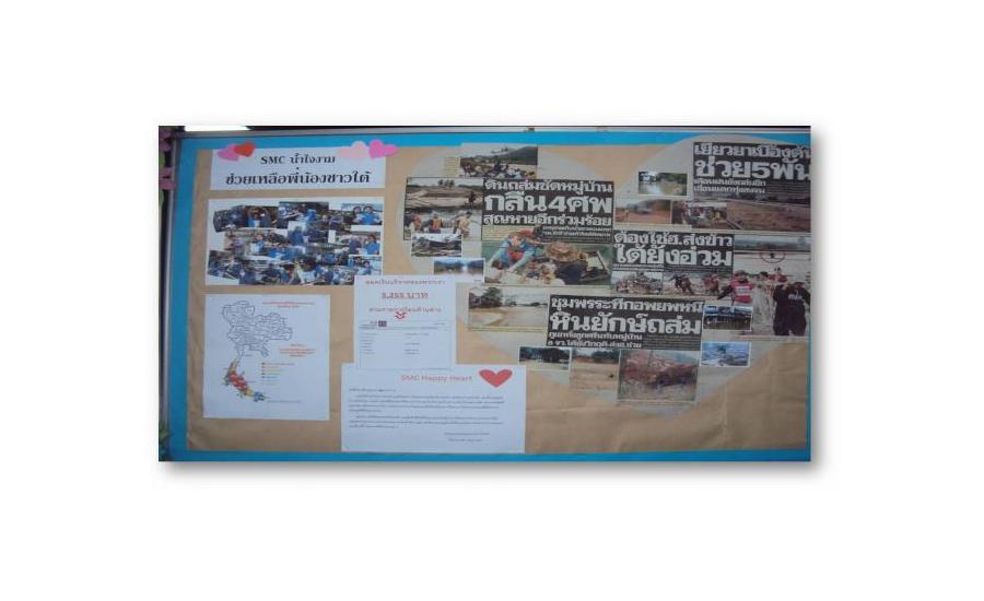 SMC has launched a relief fund for disaster victims in southern Thailand. The impact of the flood early last year. SMC Team have contributed cash to donate aht 5,255 Baht to the victims. Everyone is getting ready to deal with the disaster and find solutions to their problems. To prevent recurrence. This activity makes the employees involved are sacrificed. The benefits of the group more. We have a lot of good things to do.