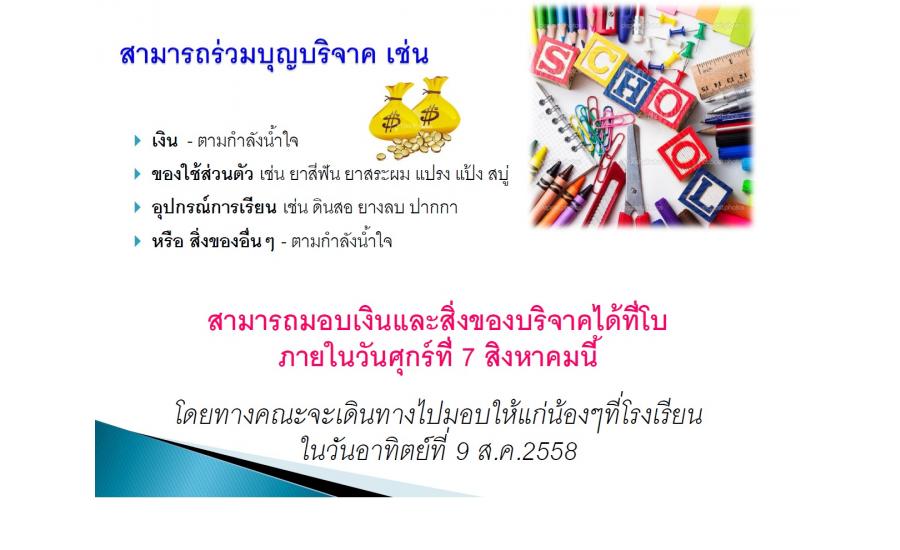 SMC Managers and employees with volunteer groups donated some money, personal belongings, school supplies, and other items such as dolls and clothing for students, teachers and staff at Suphaburi Panyanukul School, Redruth Tumbon Sai District, Muang District, Suphan Buri Province.