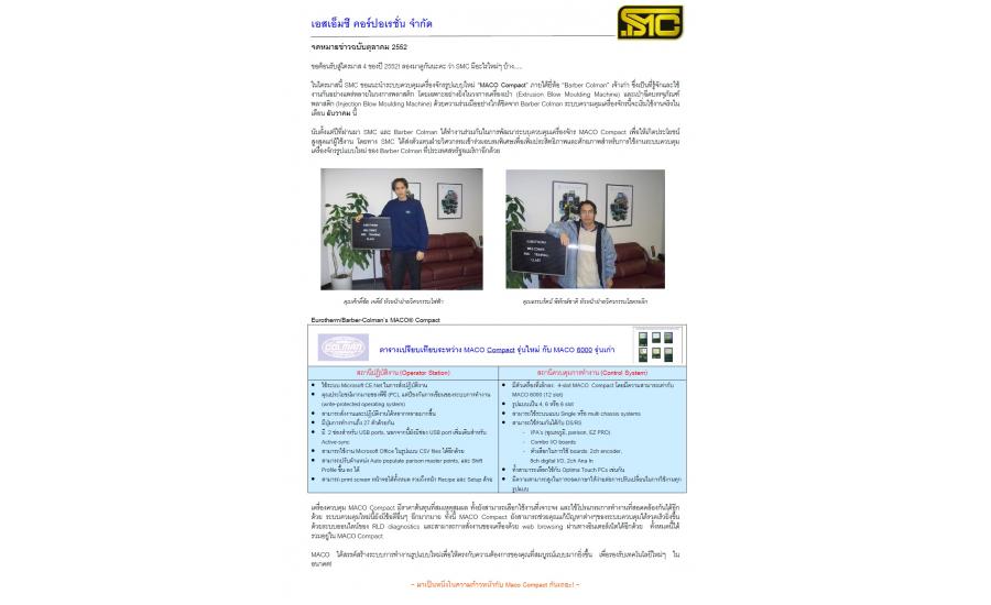 Since last year, SMC and Barber Colman has worked together in developing MACO Compact controller system for SMC blow moulding machine applications. SMC Engineers, Jedee Sakchai and Thammarat Pitakchat have received special trainings to augment their knowledge on Barber Colman controllers.