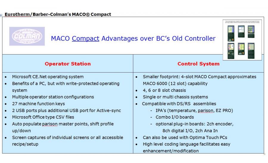 SMC Corporation Ltd. will release the new version of “Barber Colman” controller called “MACO Compact” in December 2009. We all know that Barber Colman Controller is one of the most well known controllers in the plastics processing industry. Close cooperation between SMC and Barber Colman has brought the two companies worldwide successes in extrusion blow and injection blow moulding processes.