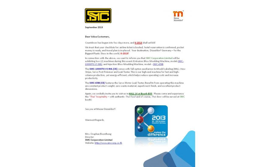 In connection with the above, we want to inform you that SMC Corporation Limited will be exhibiting two (2) machines during this event: Extrusion Blow Moulding Machine, model-SMC-10000TG VS IML; and Injection Blow Moulding Machine, model - SMC-65IB.