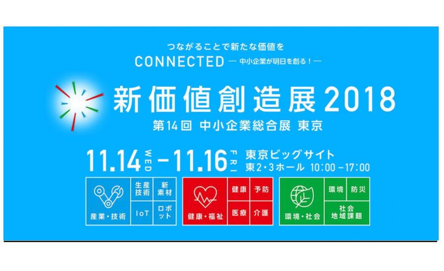 Name :New Value Creation Exhibition 2018 (14th Small and Medium Enterprise Exhibition Tokyo) Date :November 14-16, 2018 Time :10 AM to 5 PM Venue :Tokyo Big Sight No. 3-11-1 Ariake, Koto-ku, Tokyo, JAPAN